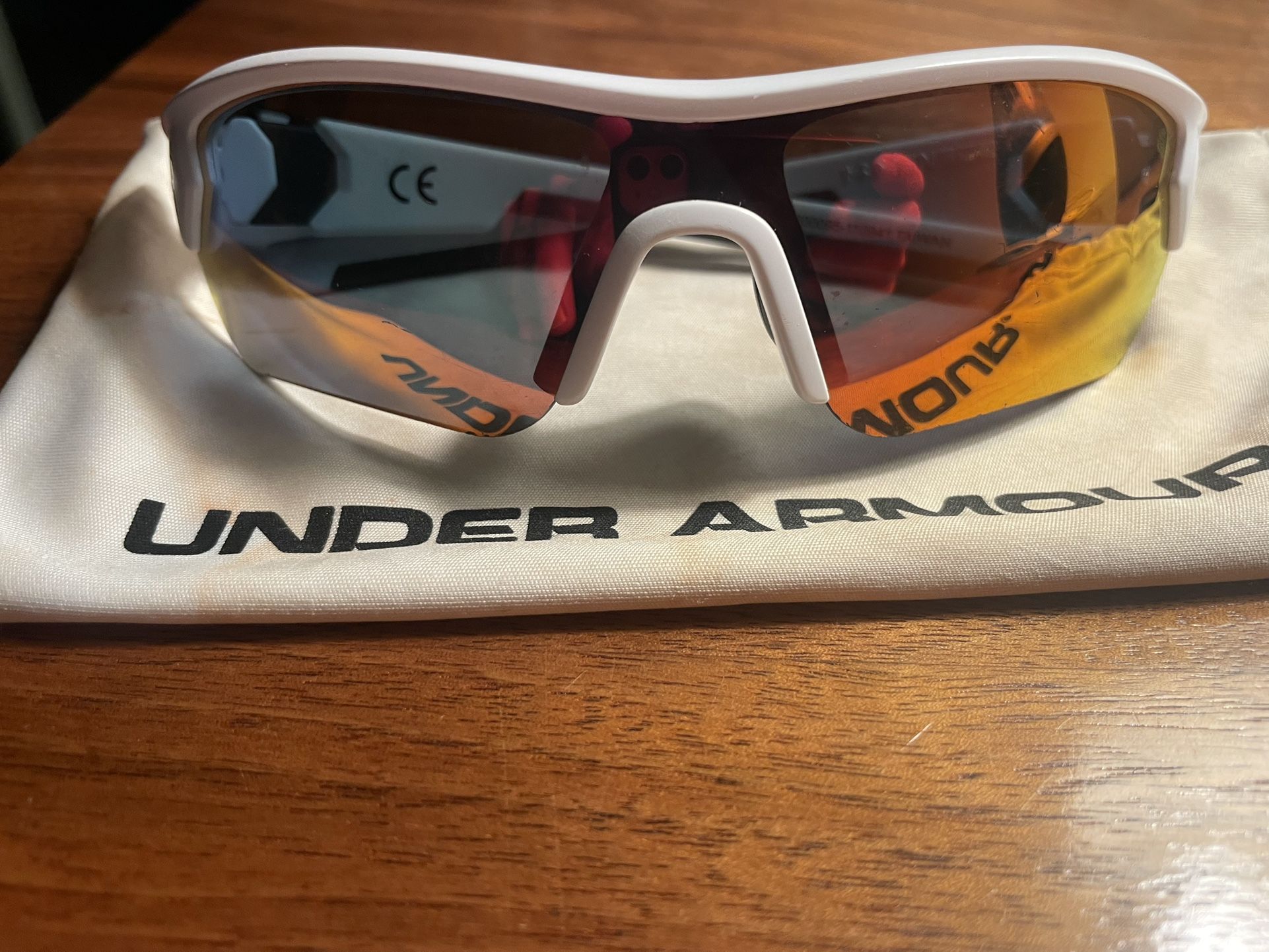 Perfect for the upcoming spring baseball or softball season! These are high-quality, youth-sized performance sunglasses in great condition. • Brand: Under Armour • Model: Gameday Jr. (Youth/Kids Fit) • Frame: Durable white and gray TR90 frames—lightweight and impact-resistant for sports • Lenses: Orange/Red mirrored lenses designed to reduce glare and improve contrast on the field • Condition: Excellent. Lenses are clear and frames are sturdy • Includes: Original Under Armour microfiber cleaning/storage pouch