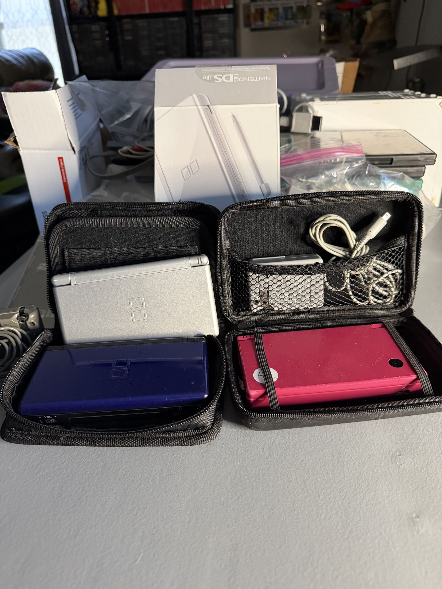 Bundle: 1-silver DS (shell9/10, screen needs to be replaced 1-pink DSI (shell 5/10, works perfectly) 1-blue Ds (shell 7.5/10 needs battery) 2-OEM chargers 2-carrying case 1-OEM silver box(no inserts)