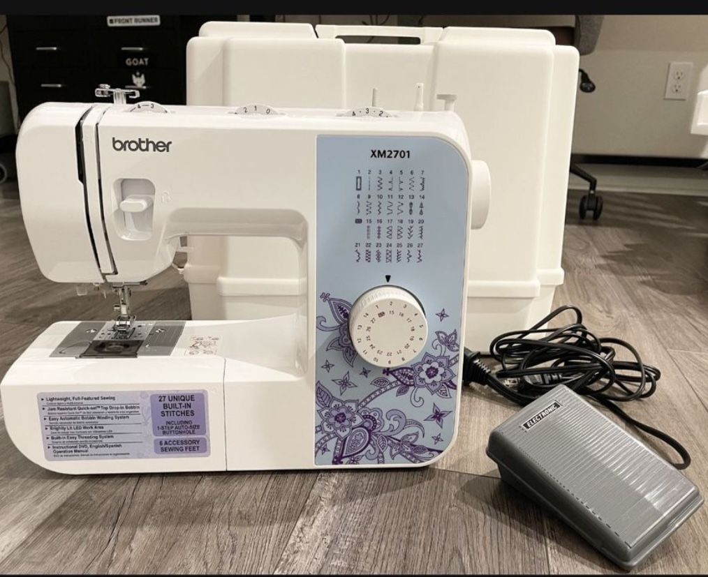 Brother Sewing Machine XM2701 w/ Hard Case Details: •Machine only used once •Excellent Condition •Owners Manual included •Machine accessories included •Amazing Hard Case to store machine The XM2701 is perfect for beginners learning to sew, and for more advanced sewers looking for versatility. Loaded with features, the XM2701 offers 27 built-in stitches, with 63 stitch functions.