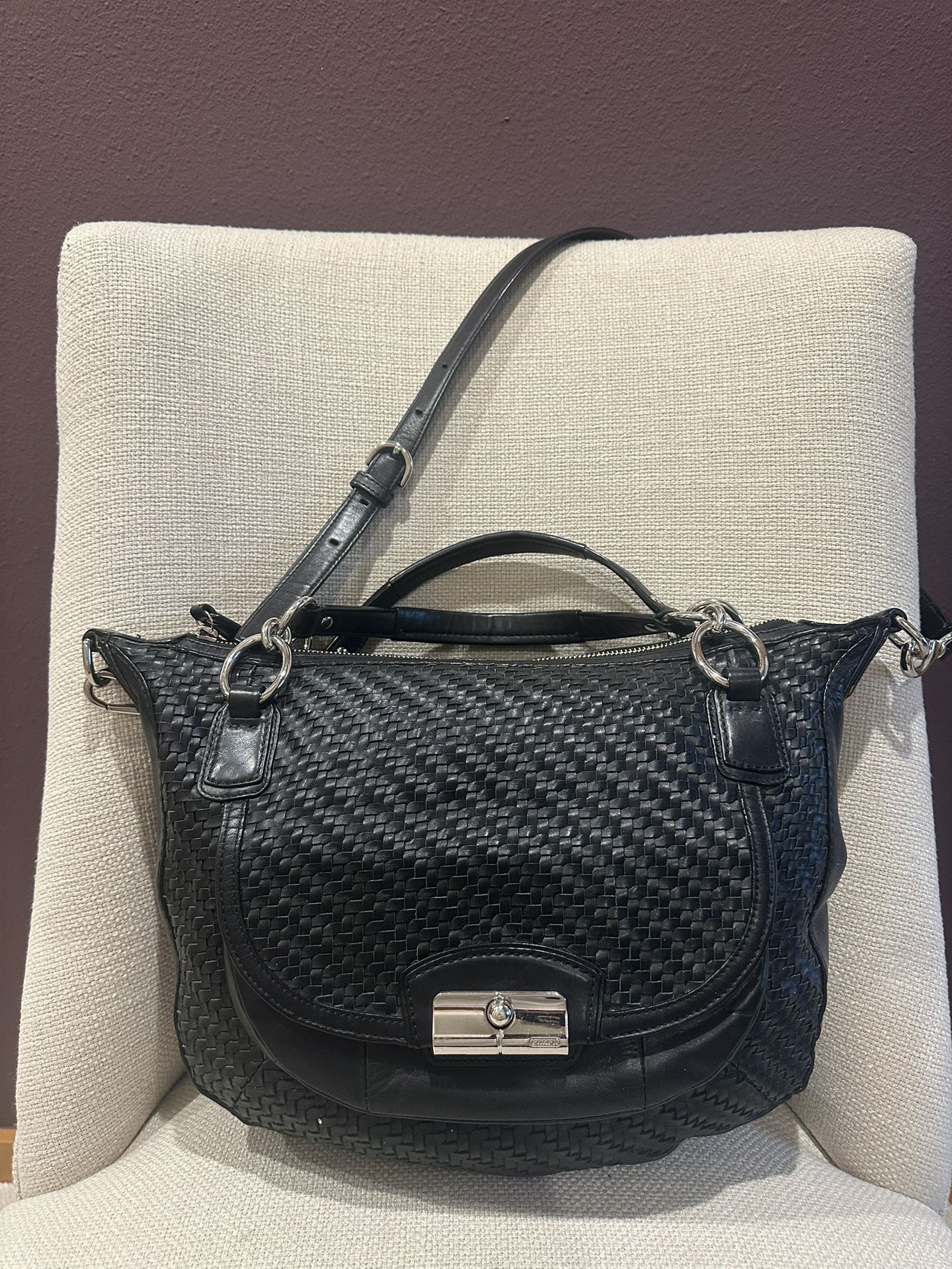 Black Woven Leather Stylish handbag with silver-tone hardware. Features a secure turn-lock closure, top handle, and an adjustable/removable shoulder strap for versatile wear. Spacious interior perfect for everyday essentials. Classic, timeless design that pairs easily with casual or dressy outfits. Woven leather exterior Black leather trim Silver-tone hardware Turn-lock front closure Top handle + adjustable shoulder/crossbody strap Gently used, good condition