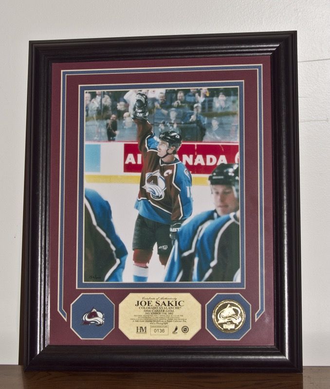 This is a beautifully framed 8x10 photograph of Joe Sakic commemorating his 500th goal. The piece also has an Avs pin and a 24K gold overlay NHL medallion within the frame. This is a great item for any sports collector.