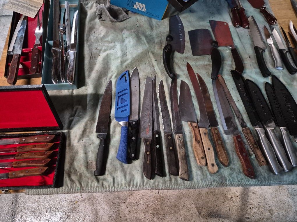 All kinds stainless steel stake,bread,bucher,every day cooking knifes there is 41 knifes 3 misc ones 150 obo I say 150 you say ?