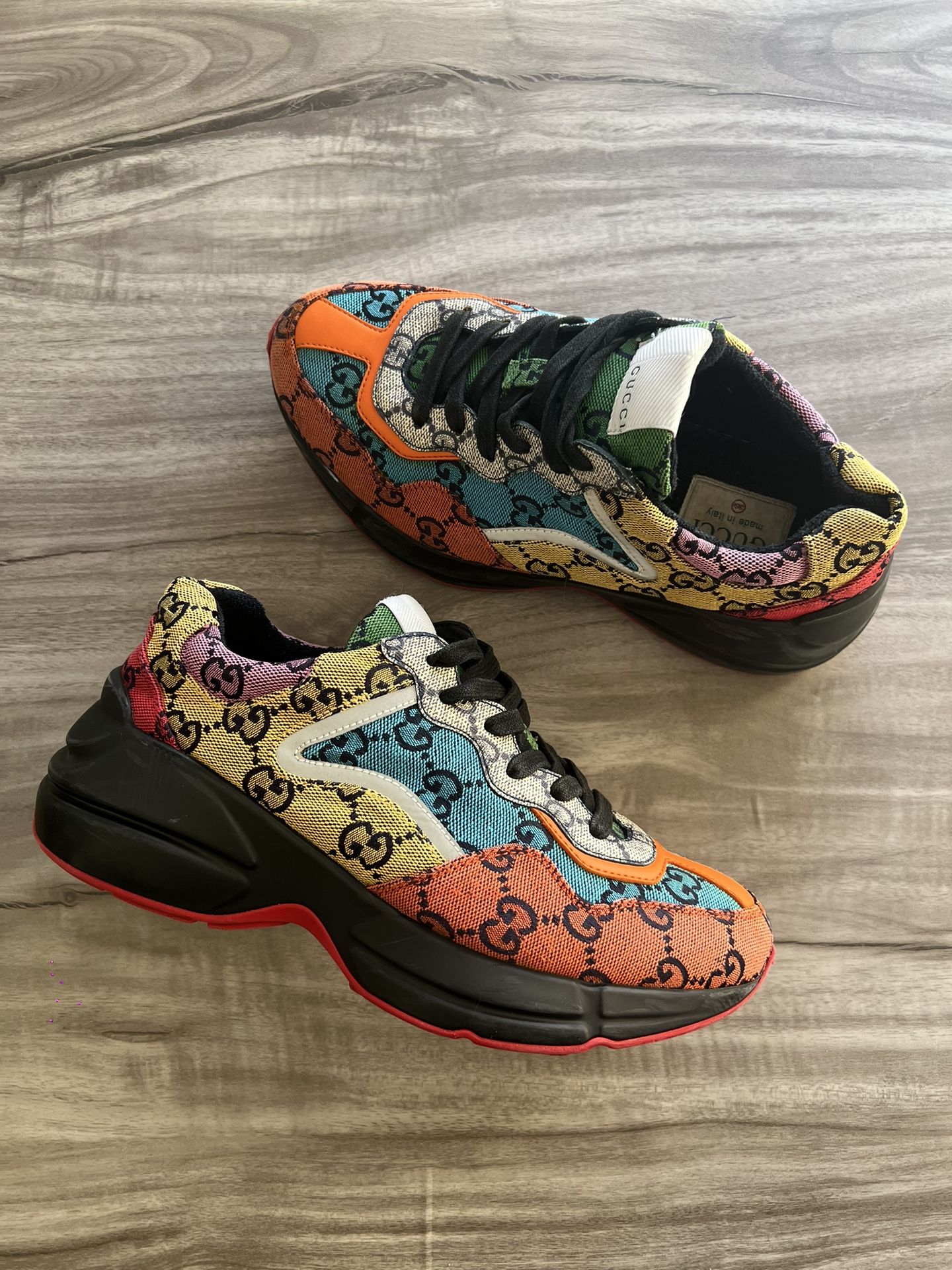 Welcome to Byrd Boxx Offer Up Store! First class designer and luxury items at second hand pricing📦✅ Gucci Rhyton GG Monogram Multicolor Size 6 Women’s (EU 36.5) 100% authentic. Unfortunately no original box included. Signs of wear around black midsole (shown in photos) Please be sure to ask any additional questions, and to check out our other high end and luxury listings!