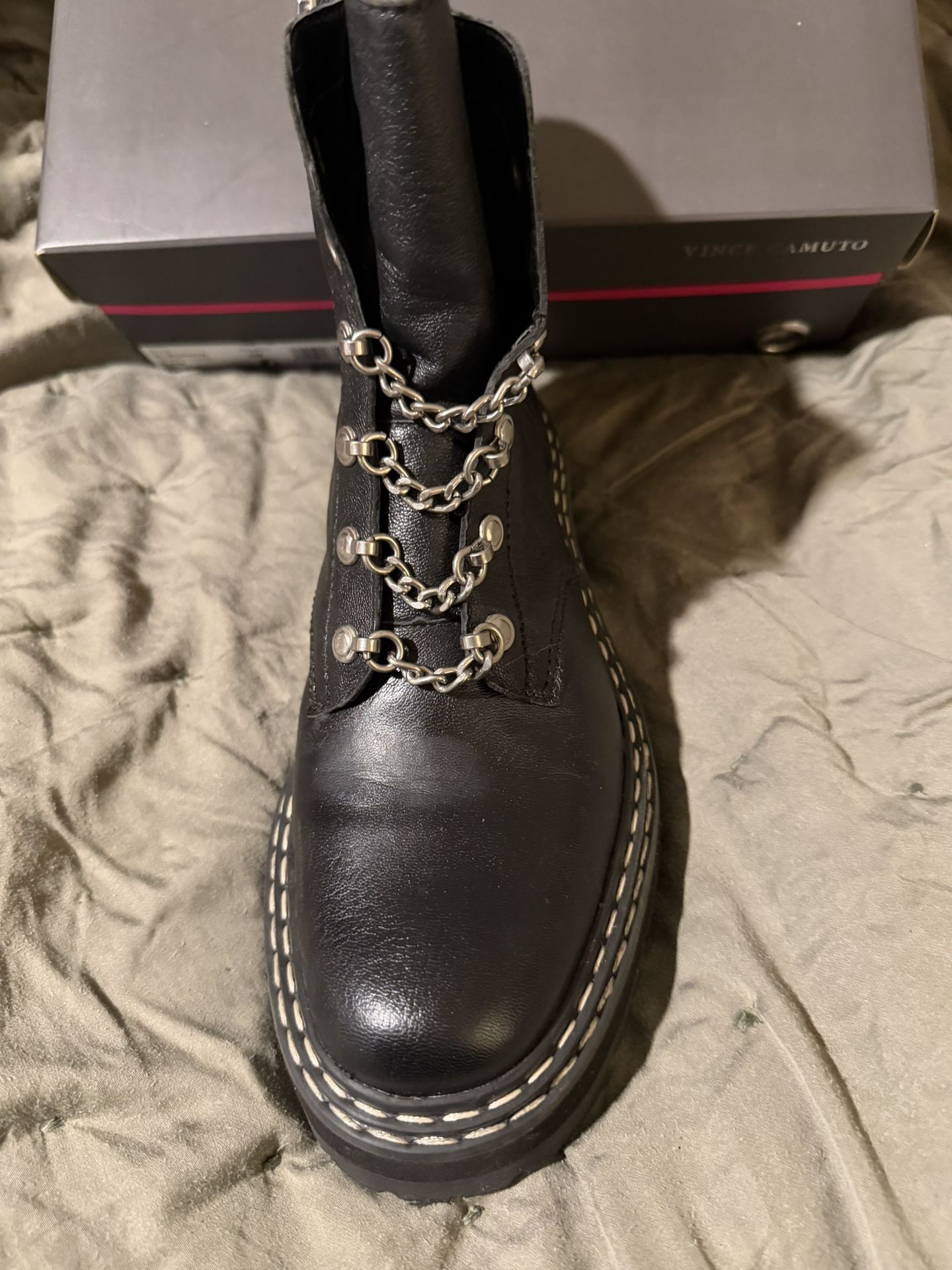 Vince Camuto black boot with chain detail. Style VC-POPINTA. Black soft goat. Size 9