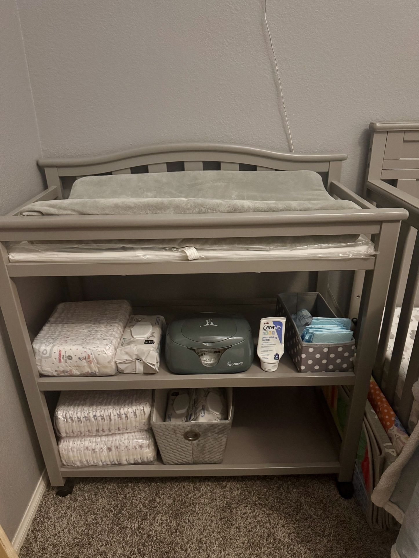 Gray crib and changing table. Changing table is like new, crib has minor scratches from moving. Changing table comes with a brand new pad that came with the table plus an extra serta waterproof pad and cover that's machine washable. Crib has 4 height settings and comes with waterproof mattress and 2 waterproof covers that are machine washable as well.