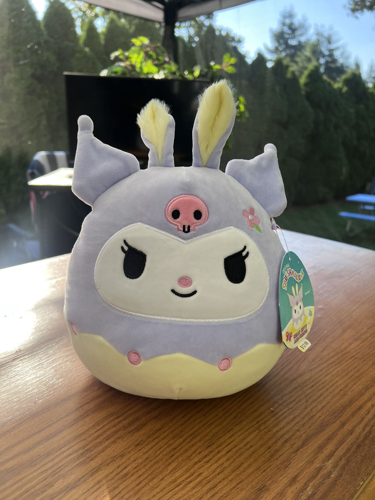 Hello Kitty Kuromi Easter Bunny Suit Plush Stuffed Toy - **Description:** Squish time is playtime when you add this adorable 8-inch Hello Kitty Kuromi plush stuffed toy to your Squishmallows Squad. Made with high-quality, ultra-soft materials, it’s perfect for snuggling while relaxing at home, watching movies, or on long car or plane rides. These lovable Squishmallows are the softest and cutest plush toys around! Join the Squad! **Features:** - **SQUAD UP:** Grow your child's Squishmallows Squad with this 8-inch plush toy. - **SNUGGLE, SQUEEZE, AND PLAY:** Ideal for long car rides, airplanes, movie marathons, and more. - **MUST-HAVE:** Made with ultra-soft, high-quality materials. - **UNIQUE PERSONALITIES:** Available in a variety of personalities, colors, and sizes. - **AUTHENTIC:** Original Kellytoy Squishmallows!