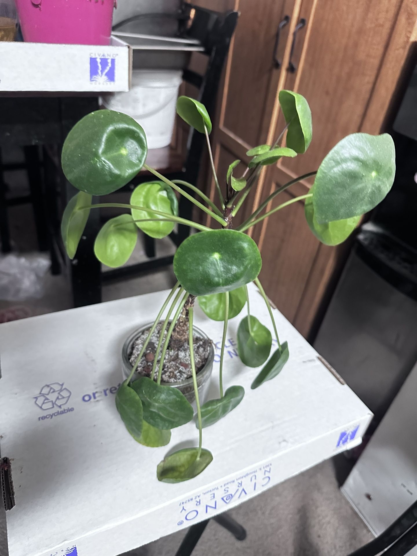 Chinese money plant. Healthy in 4 in glass pot.