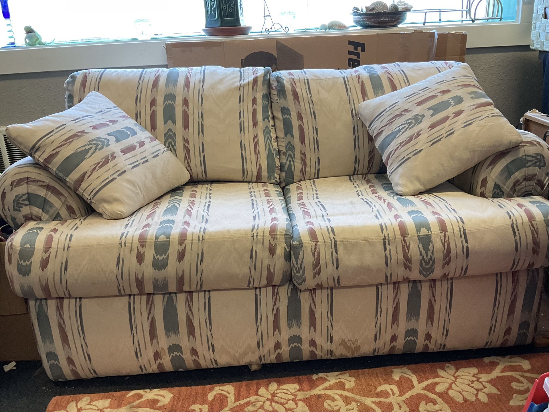 In excellent condition so comfortable you will love it . It’s a standard size so if ya don’t like the pattern you could get a loveseat cover a great deal. Could use a little cleaning such a great deal.