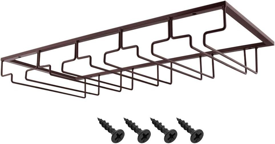MOCOUM Wine Glasses Rack Under Cabinet Stemware Rack, Wine Glass Hanger Rack Wire Wine Glass Holder Storage Hanger for Cabinet Kitchen Bar (Brown, 5 Rows 1 Pack)