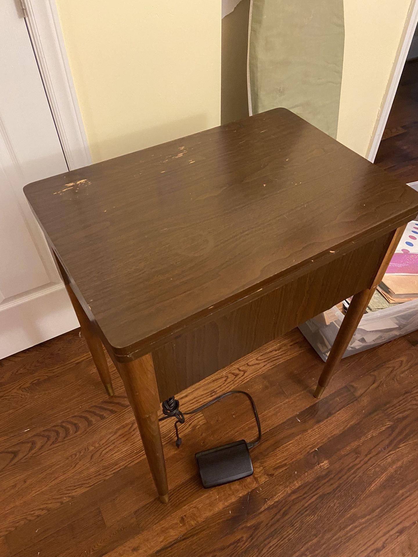 This sewing machine does not currently work… Has been used as a table for the last several years.