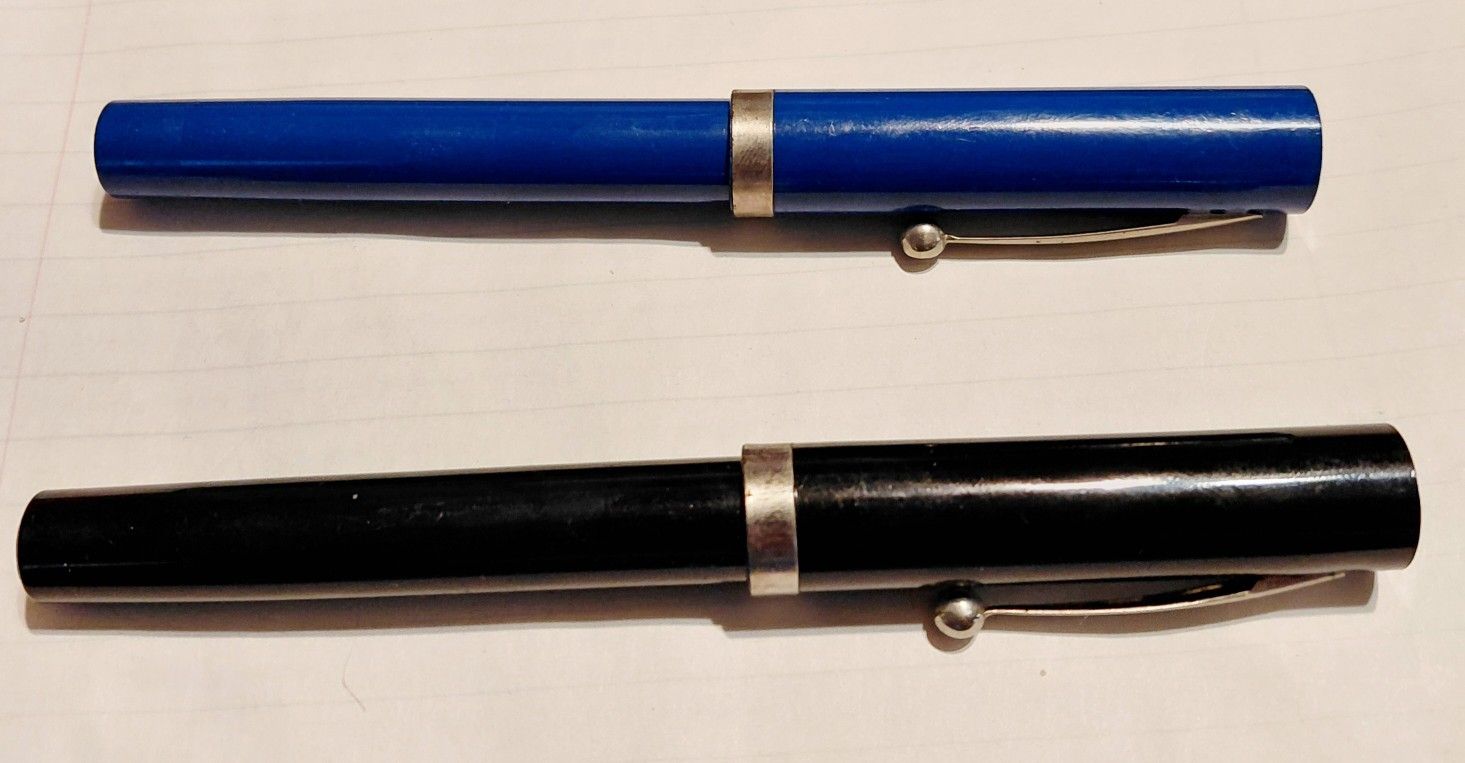 Vintage Sheaffer No Nonsense fountain pens, known for their flat-top design and simple cartridge-filling mechanism, often used as student or calligraphy pens. The pens feature a simple, cylindrical barrel and cap with a flat top and bottom. They were produced by Sheaffer, a company known for its writing instruments since 1912. The pens are collectible items, with various colors and nib sizes available. They typically use Sheaffer's proprietary ink cartridges. Selling as collectibles. May need refurbishing if you want to use them. I was unable to twist open the blue one