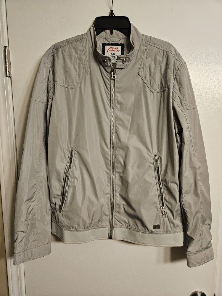Diesel Industry Men's Grey Quilted Snap Button Detail Lightweight Moto Windbreaker Jacket. Like new condition - Metal snap button detailing. - Quilted patches along shoulders, lower back and elbows. - Zippered cuffs. - Interior side pocket with velcro closure. - Front zippered pockets. - Lined