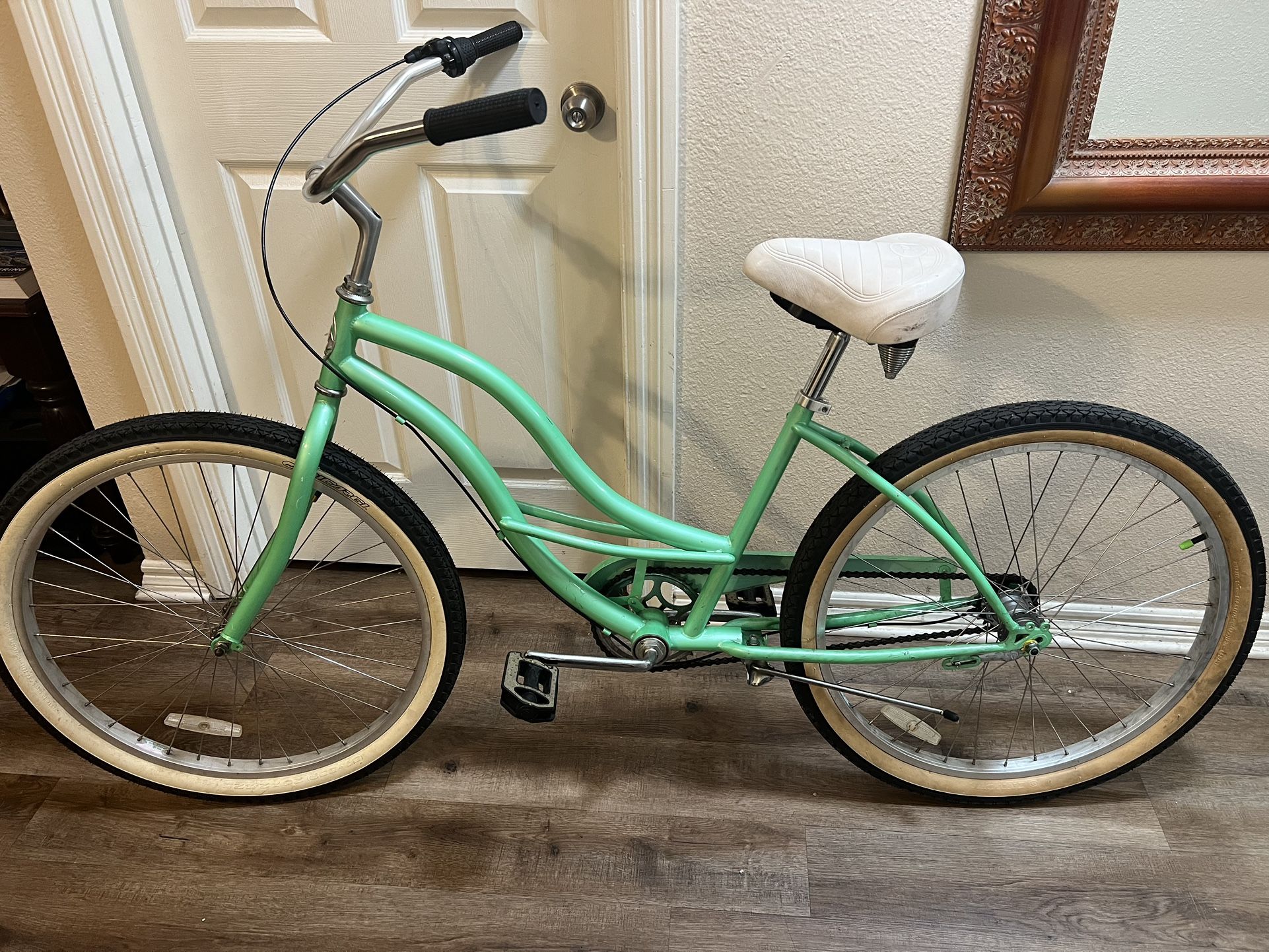 Beach cruiser bike. Micargi brand. 26” wheels. Sea-foam paint scheme. Three-speed gears (most beach cruisers are only one-speed). Rear drum brake. New flat-resistant “Slime” tubes installed. Comes with color-matched fenders, for riding in the rain. Very nice condition. Rides excellent. $80