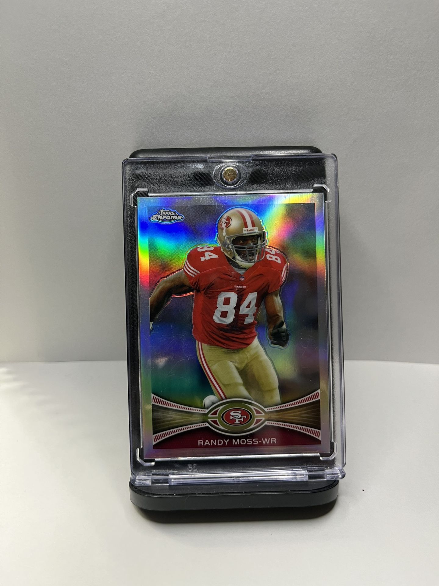 The product is a 2012 Topps Chrome trading card featuring Randy Moss of the San Francisco 49ers. This particular card is a rare X-Fractor parallel with card number 32. It is a part of the base set for the 2012 NFL season and is in near mint or better condition. Manufactured by Topps, this sports trading card is a valuable collectible for fans of football and Randy Moss.