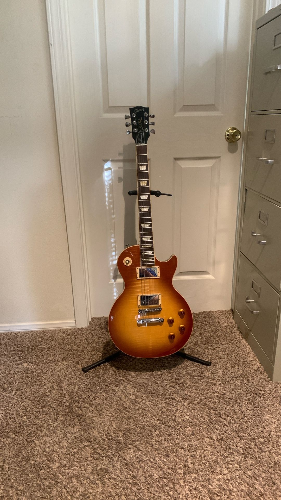 This guitar is in excellent condition. The 2008 Les Paul has all the classic vibe with some modern upgrades. The neck has an asymmetrical shape, thinner on the treble side for ease of play and thicker on the bass side to add mass. It also has locking tuners, a locking jack input and Burstbucker pickups.
