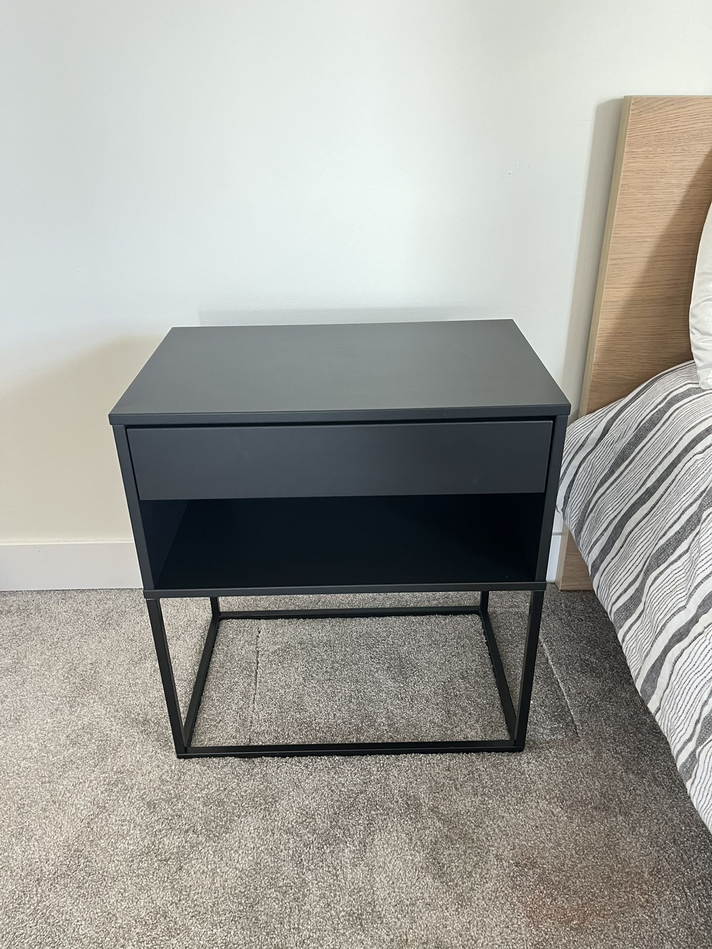 Modern black nightstand in great condition. Features a sleek, minimalist design with a drawer for hidden storage and an open shelf underneath. Sturdy metal frame with a smooth finish—perfect for a bedroom or as a side table. Clean, well-maintained, and ready for pickup. CASH ONLY