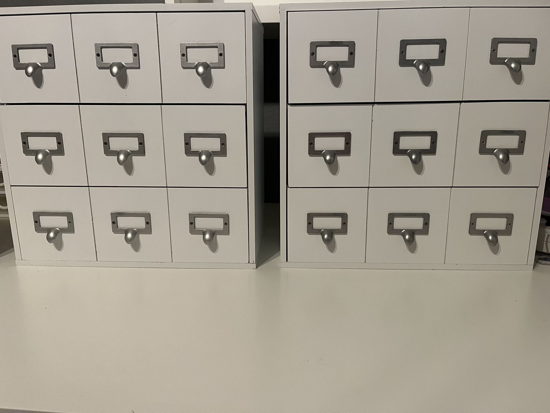 I have two drawer organizers for sale. Each unit has three drawers. Each drawer has 3 compartments for a total of nine compartments . White 3 drawers Height 14- 1/4 Width 14- 1/4 Depth 7- 1/4 Holds art supplies,craft supplies etc Each unit is $25 each Cash only Redlands