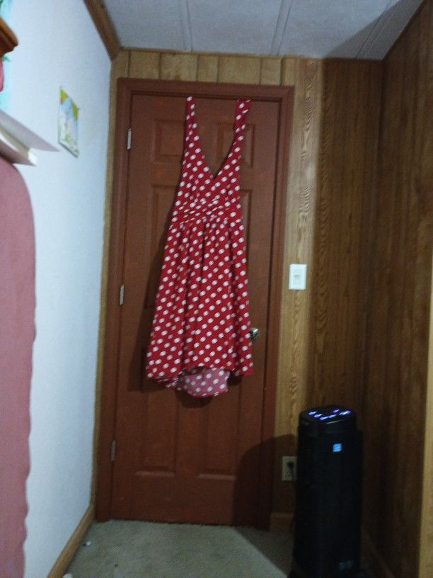 Red polka dotted halter dress size medium to large. I'm 5'4 and 215 lb for a reference it fits me like a glove just go out much.