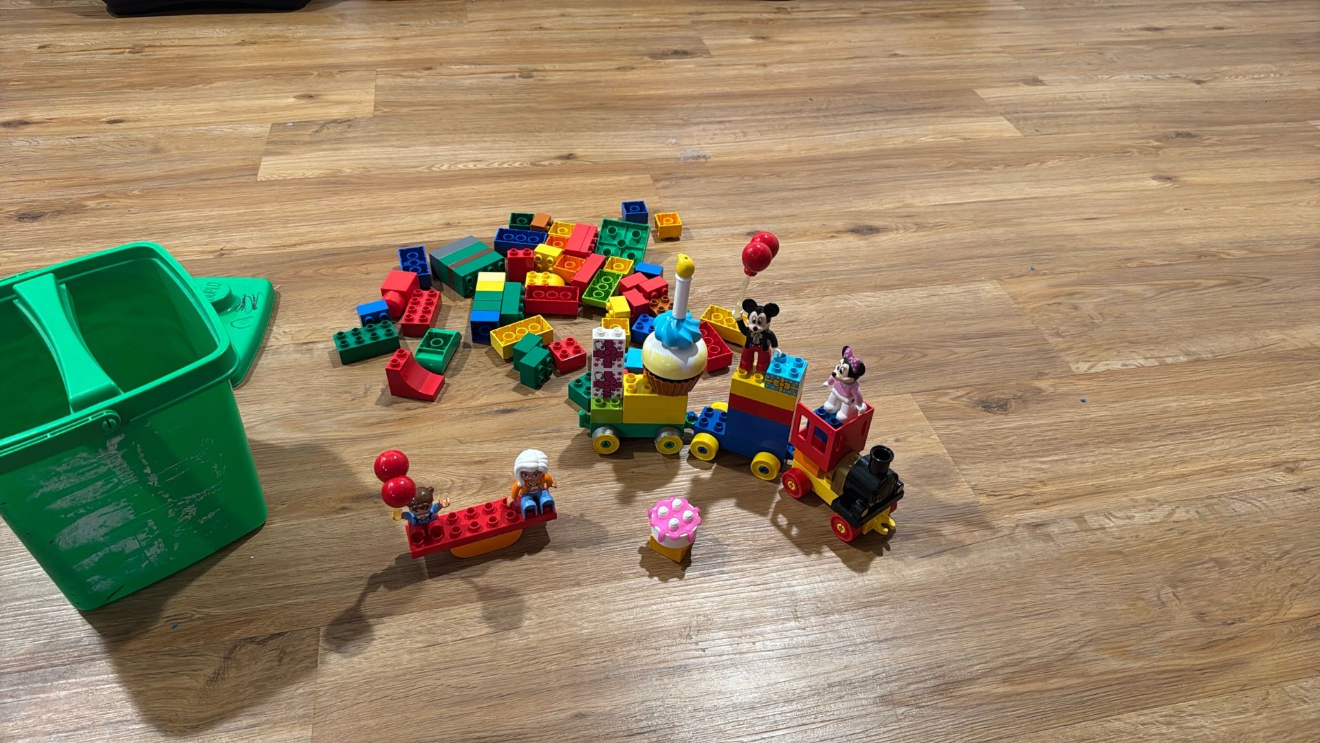 A bucket of Duplo Lego, including a birthday train with Mickey and Minnie Mouse. $5 or free, if needed.