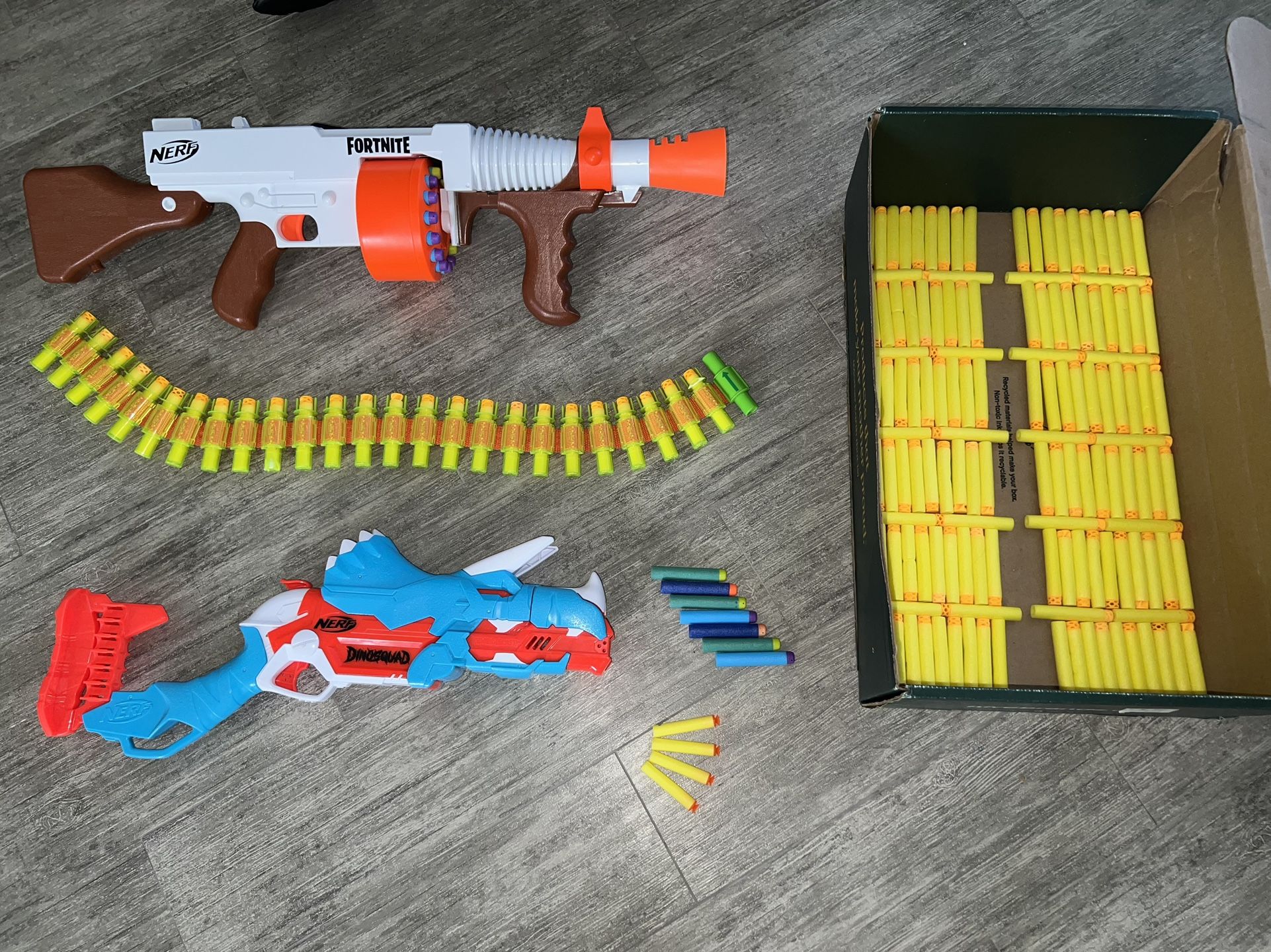Nerf FORTNITE DG Dart Blaster is inspired by the one used in Fortnite, capturing the look of the blaster from the popular video game. DG blast with rotating 15 dart drum: fire off 15 darts in a row from this pump, action blaster! Pump the grip to prime the blaster, then press the trigger to fire each dart. No batteries required. —- AND —- Nerf DinoSquad Tricera Blaster with 12-dart storage and quick 3-dart loading with Triceratops dinosaur design. —- AND —- 1 Nerf pro-ammo belt and over 125 official premium Nerf darts Over 65% OFF original price and in like-new condition. Call Brian at (contact info removed) now!!! Makes an AMAZING gift, call now, you won’t be disappointed!