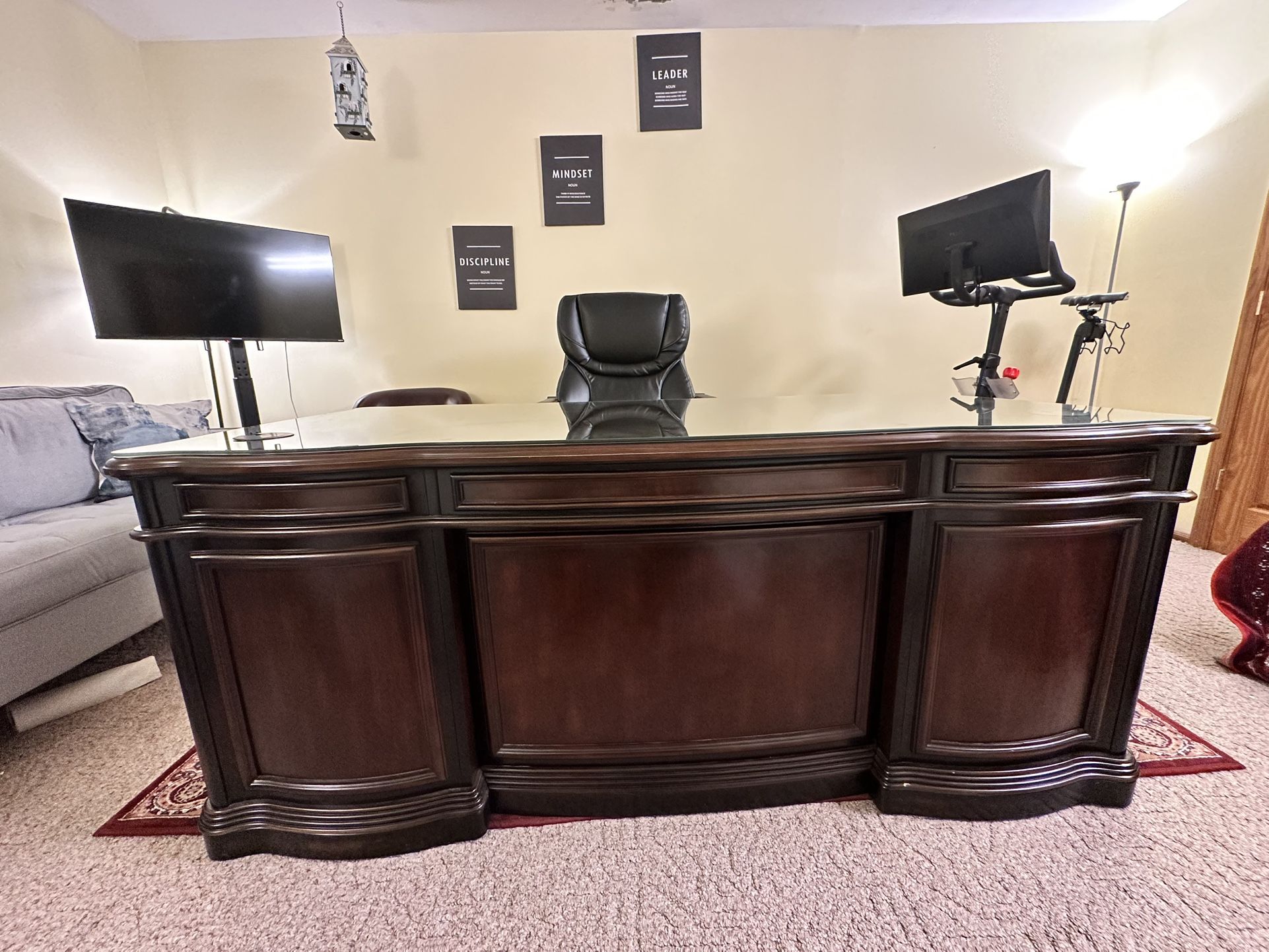 Upgrade your workspace with this high-quality executive office desk — originally a brand new premium desk retailing around $2,700-plus — now available used for only $800! Made for style, durability, and functionality, this desk features a custom glass top added for an elegant, modern finish and durable writing surface. ✨ Why You’ll Love It: • Spacious executive-style desk — perfect for home office or professional workspace. • Custom glass top — adds a sleek look and protects the surface from scratches, spills, and wear. • Large work surface — ideal for dual monitors, paperwork, and daily work tasks. • Sturdy construction designed for years of daily use. • Classic and timeless design — complements modern or traditional decor. 🧼 Condition: Gently used and well cared for — solid structure, clean glass top, no major damage. Looks great in person! 📏 Size: Length: 74.0 Width: 36.0 Height: 30.0 Works great in home offices, large bedrooms, or executive suites.