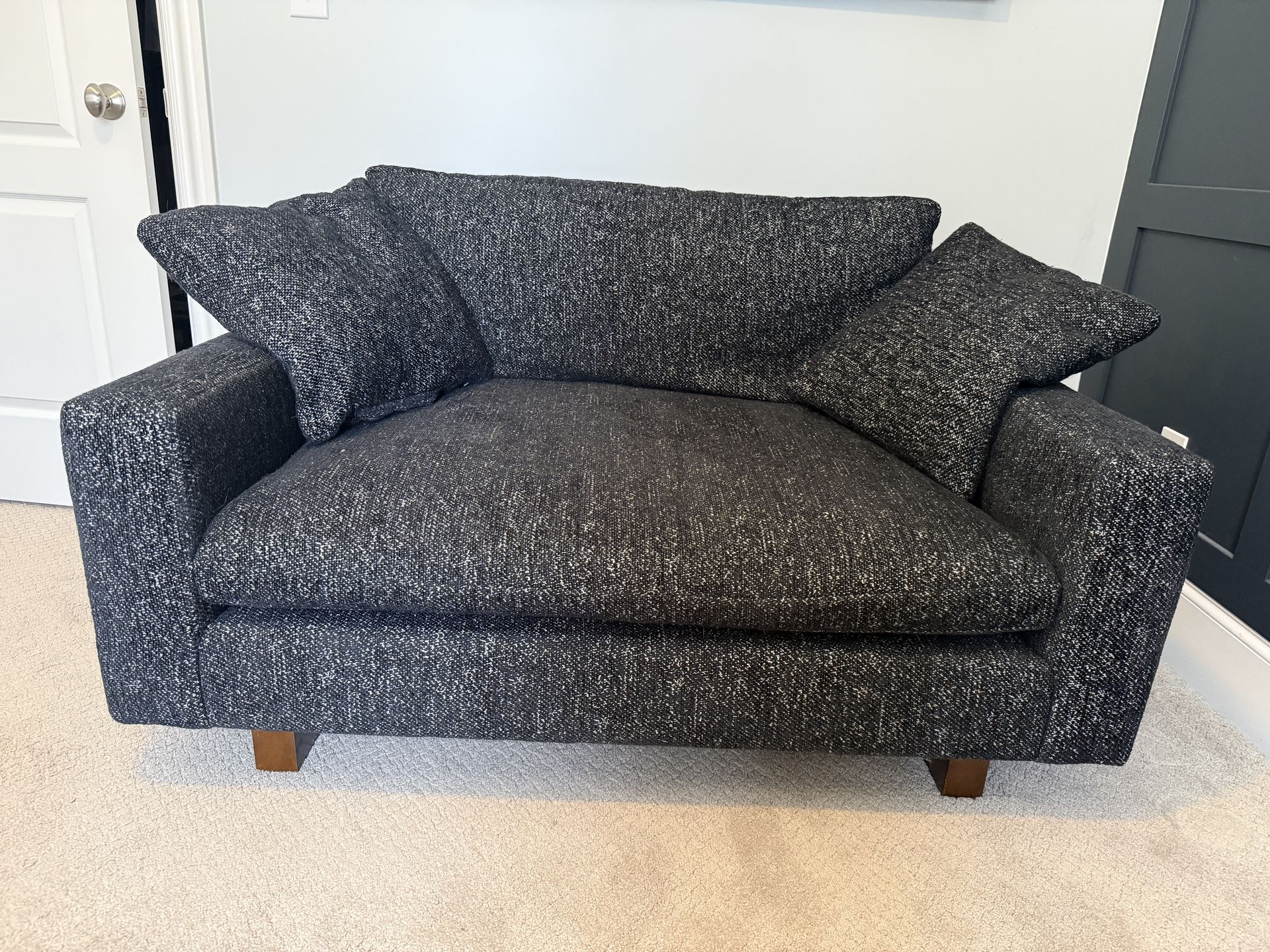 West Elm Harmony Chair and a Half, Down Blend, Black, Chunky Chenille, with Dark Walnut feet. This chair has no tears and is lightly used. Made-to-order chair. Orginal price was $1,1316. Dimensions: 55” x 41” x 29”