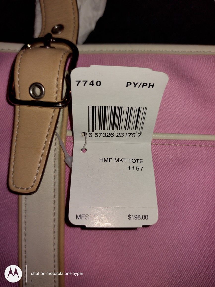 BRAND NEW COACH BAG NEVER USED TAGS ON BAG. BEEN IN THE CLOSET. PINK CANVAS OFF WHITE LEATHER STRAPS
