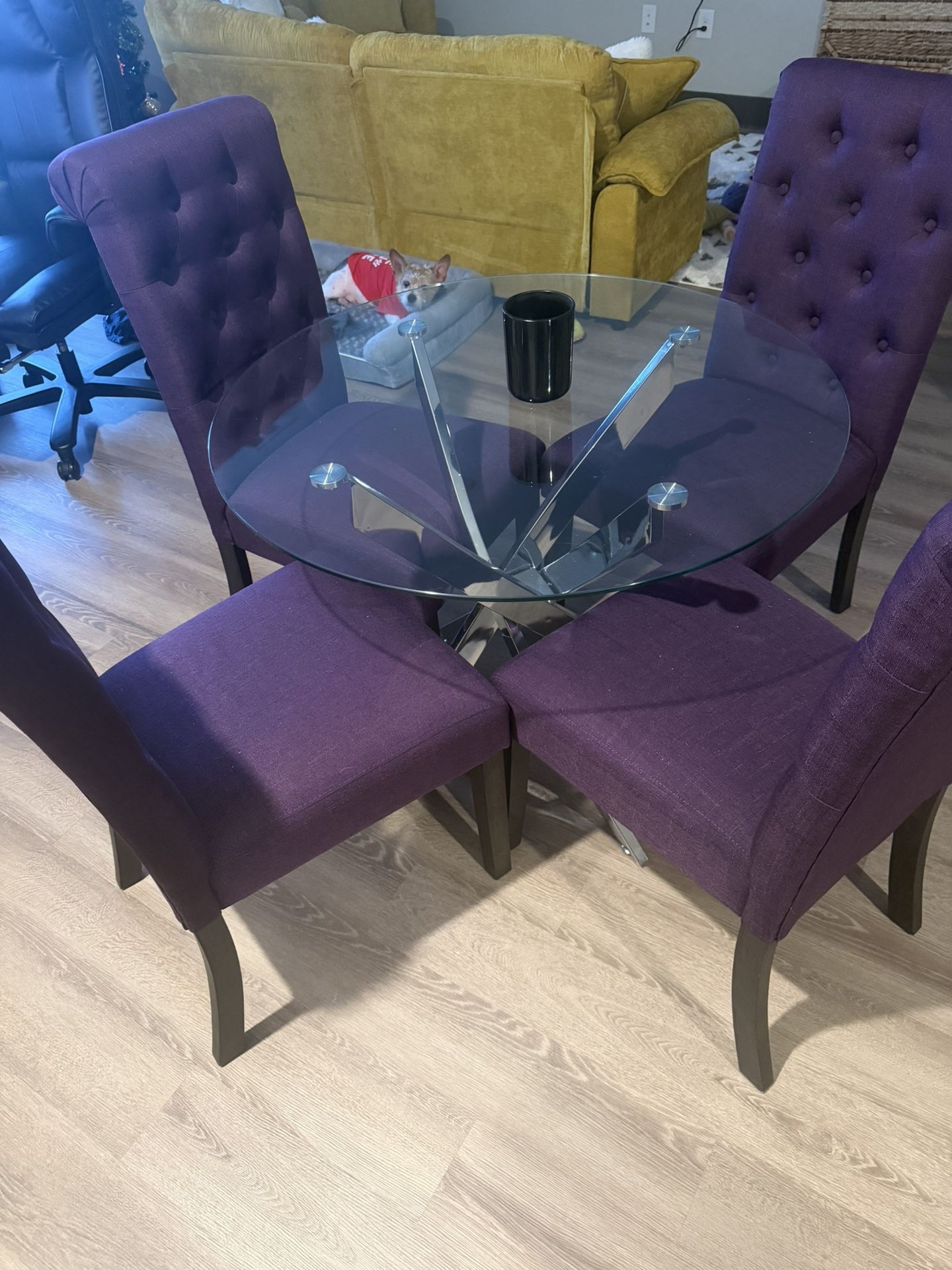 Selling a modern glass dining table with 4 upholstered tufted chairs. This set was almost never used and is in perfect condition — no stains, no damage, and the glass is in great shape. ✨ Includes: • Round glass dining table with chrome base • 4 purple tufted dining chairs 📌 Pickup Only • Located in Cumming, GA • I live on the 3rd floor, but there is an elevator • Buyer must bring their own help for moving/loading Message me if interested!