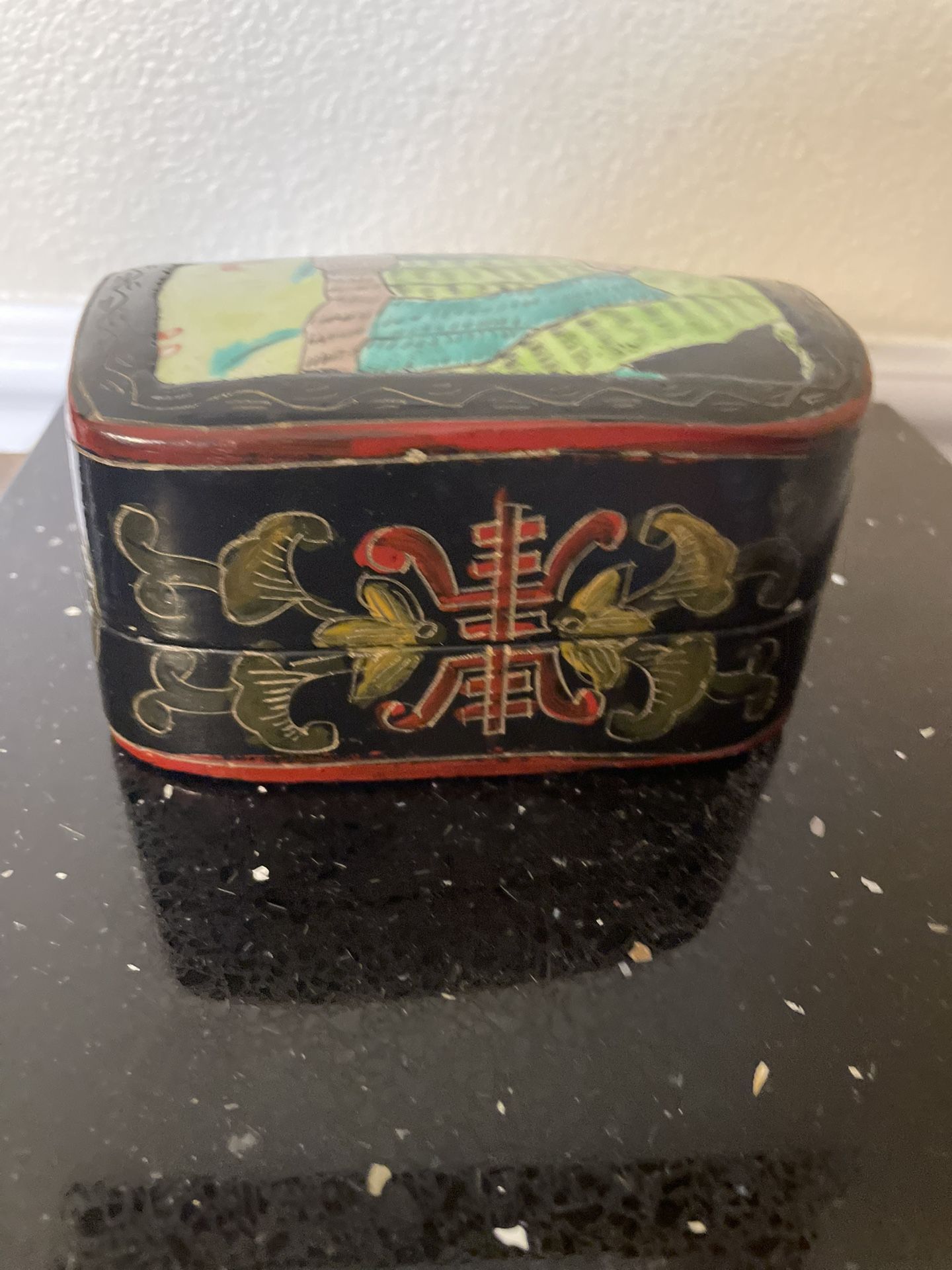 Vintage Chinese Lacquer Trinket Box w/ Hand painted Antique Porcelain Inlay 5”x3.5”