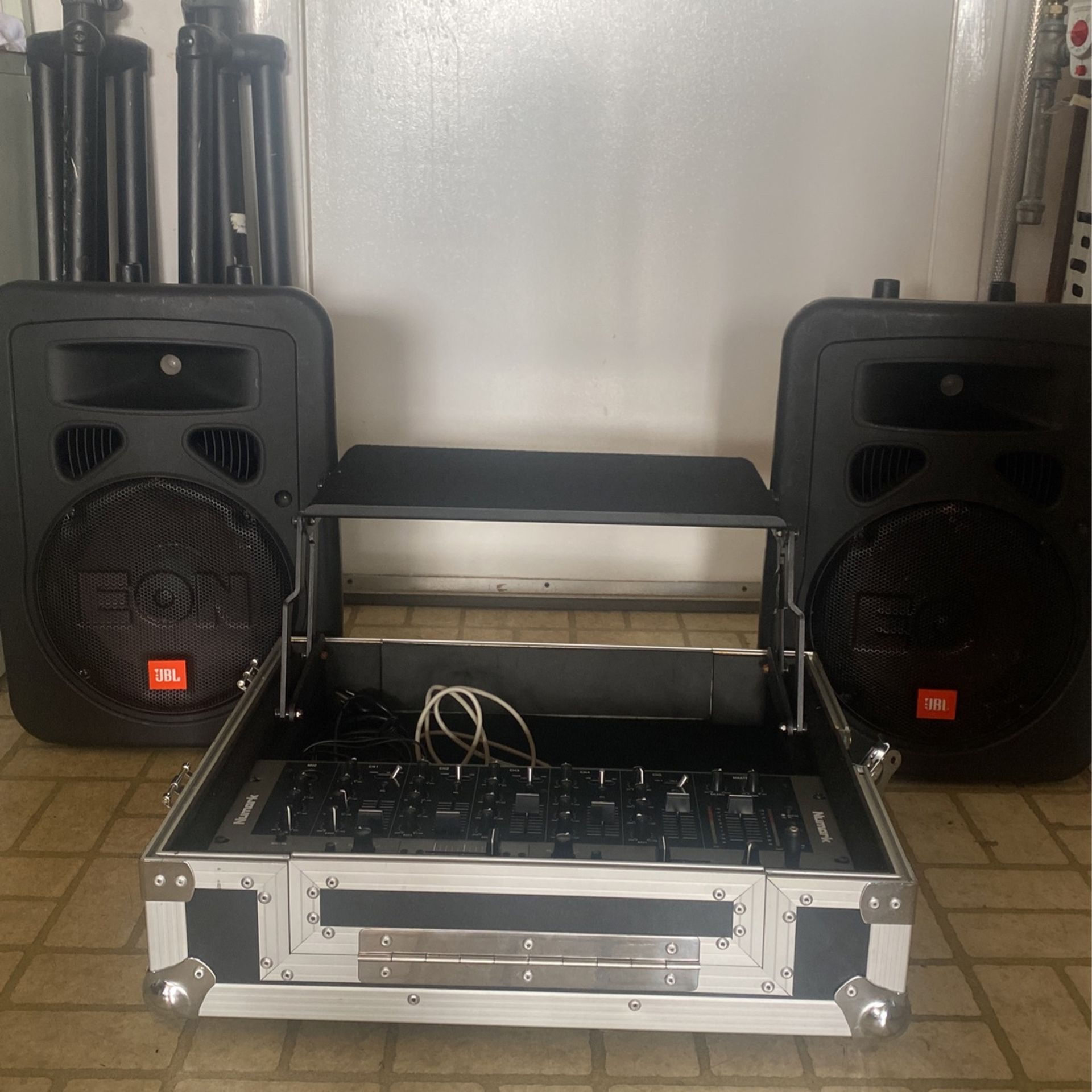 Professional audio mixer set 2 jbl eon speakers Númark c3usb audio mixer A hard case for the mixer 2 speaker tripods Open to offers
