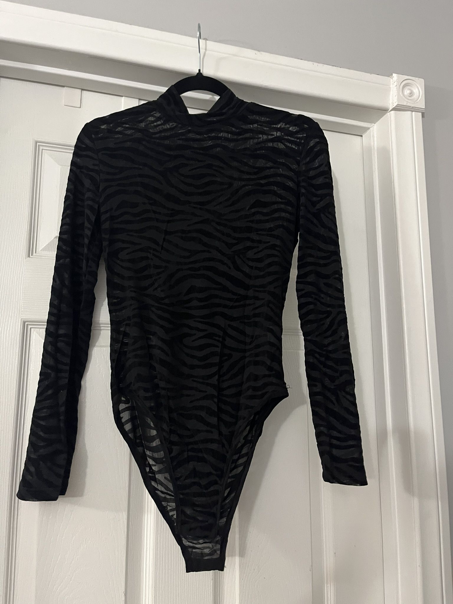 This zebra print bodysuit in size S features a collared neckline, snap closure, and long sleeves, making it suitable for all occasions. Made from a lightweight and stretchy material of 95% polyester and 5% spandex, this bodysuit is designed for comfort and skin sensitivity. The classic/fitted sleeve style and regular fit ensure a flattering silhouette. With a timeless black color and zebra pattern, this bodysuit is a versatile piece that can be worn in all seasons. Additionally, it is recommended to wash separately or professionally dry clean for garment care.