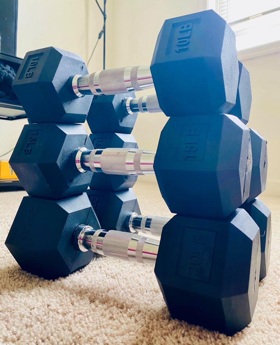 Rubber Encased Hex Dumbbell Set 10, 15, 20lb Pairs