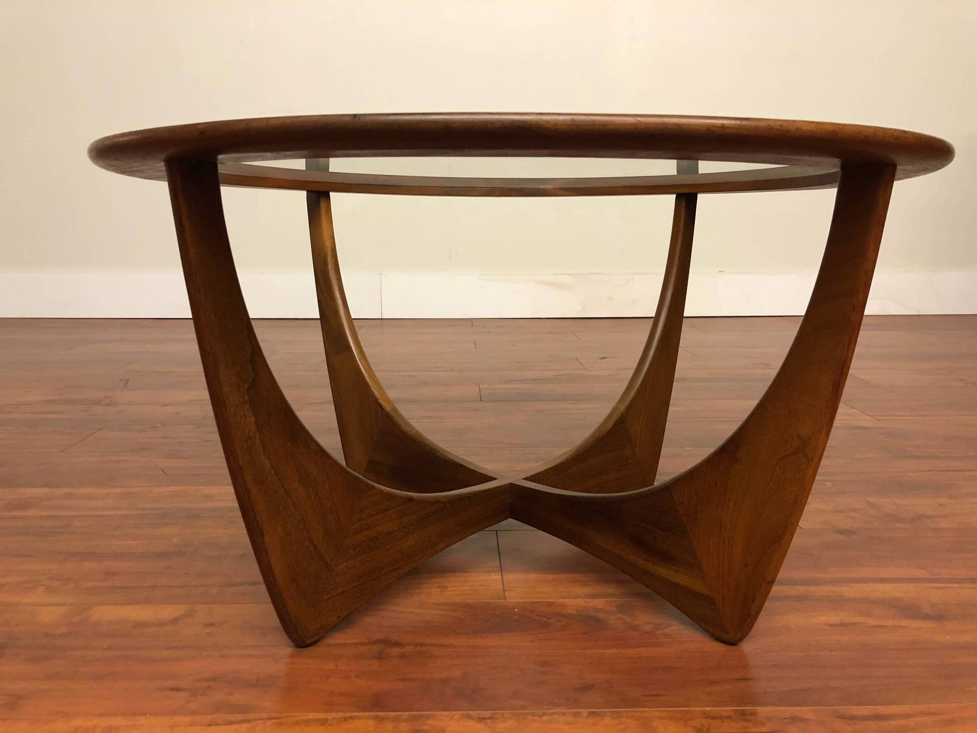 Vintage mid-century afromosia (African teak) and glass round coffee / side table, part of the Astro Line designed by V.B. Wilkins for G-Plan circa 1960's. The afromosia base has a fantastic organic design, very stylish with a light feel. It's in very good vintage condition with some expected minor wear to the frame, and the glass insert is in very good condition. 33" diameter, glass is 27.5" diameter, table is 18" high.