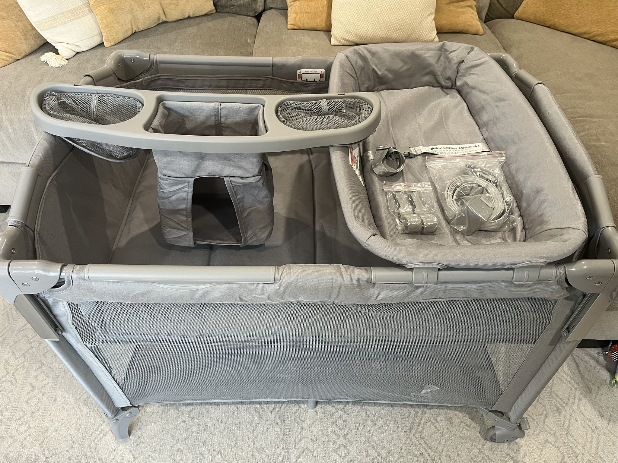 Side lowers and secures to your bed for easy bedside sleeping. Includes bassinet, changing station, and storage organizer. Only used the bassinet — the changing table and storage pieces are brand new. Folds up quickly and comes with the storage/travel bag. Great condition.