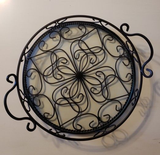 Southern Living at Home- The Jamestown Footed Serving Tray Wrought Iron Base & Handles with Glass Insert Approx measurements: Body of round portion: 13" Diameter x 3" H Handles: 16.5" W x 4.25" H Excellent condition See pictures for details Cash only please Reduced, now $40