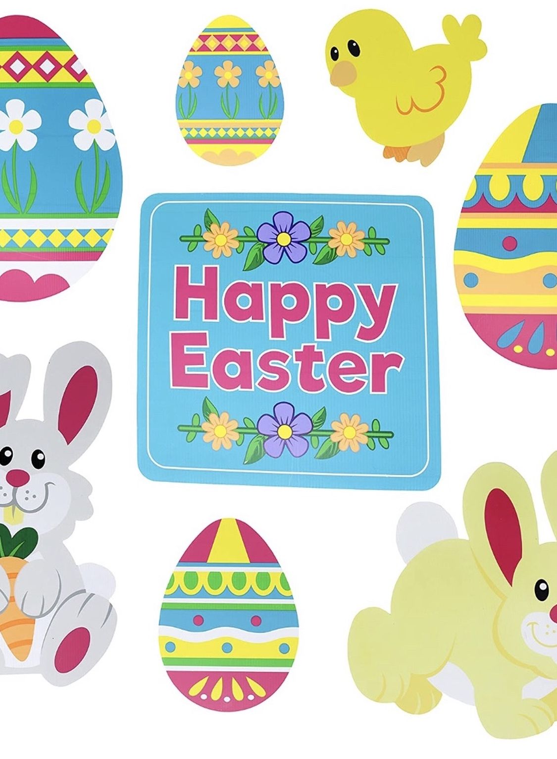 Easter Decorations Outdoor Rabbits and Eggs Yard Stake Signs Easter Lawn Decorations Contains 4 Easter Eggs (15 ¾ " H x 11 ½ " W, 15" H x 10 ¾ " W, 9 ½ " H x 7" W, 7 ¾" H x 5 ¾" W), 2 Bunnies (13" H x 14" W, 17" H x 10 ½ " W), 1 chick (7" H x 7" W) and 1 Yard Stake Sign (12 ½ " H x 13" W). Perfect for Easter Lawn Decorations and Easter Yard Decorations, including Yard Stakes.