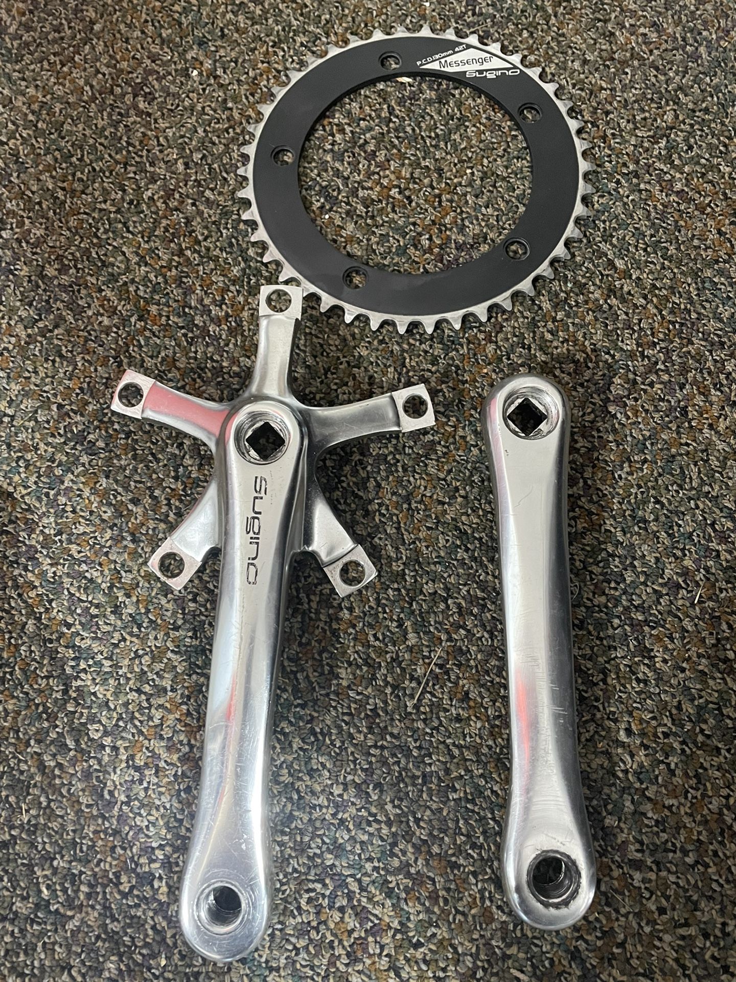 175 crank arm and 42T messenger chain ring by Sugino, very popular and sought out for. OBO