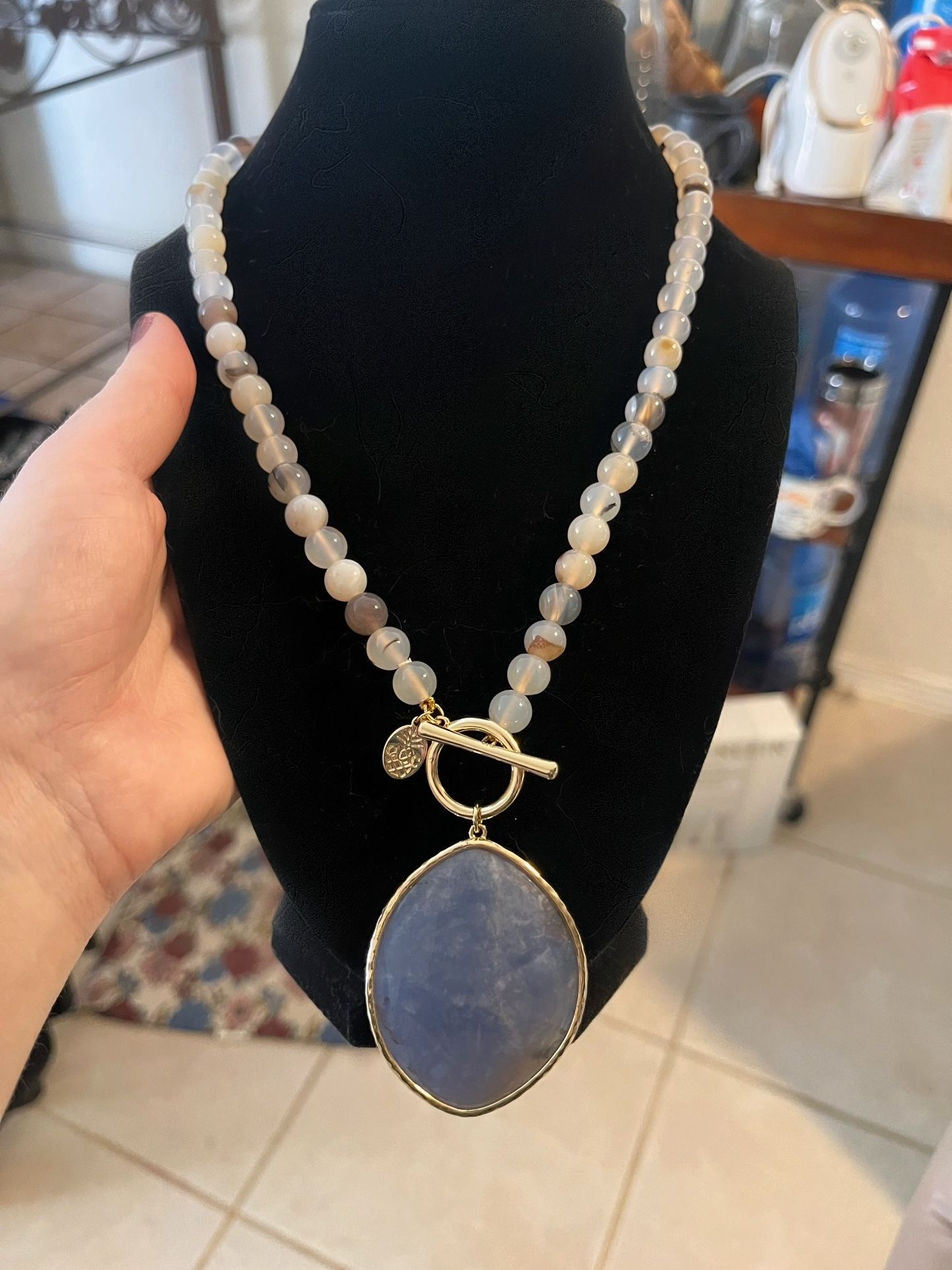 Agate necklace. Big blue agate pendant with a toggle clasp. Beads of the necklace are also natural agates. Pendant is almost 2 inches in length. Necklace is 18 inches.