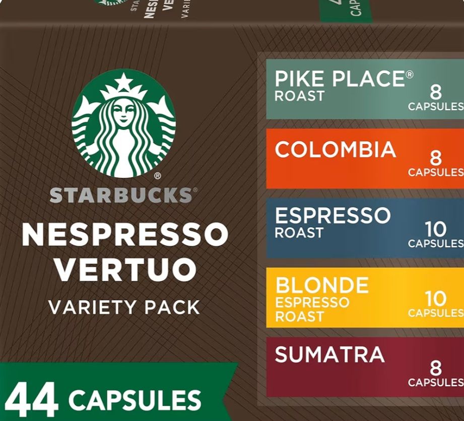 INCLUDES: Enjoy the Starbucks you love with a variety of Starbucks capsules for Nespresso Vertuo machines, including Starbucks Blonde Espresso Roast, Pike Place Roast, Colombia, Sumatra and Espresso Roast — a total of 24 coffee and 20 espresso capsule. 44 loose pods in total.