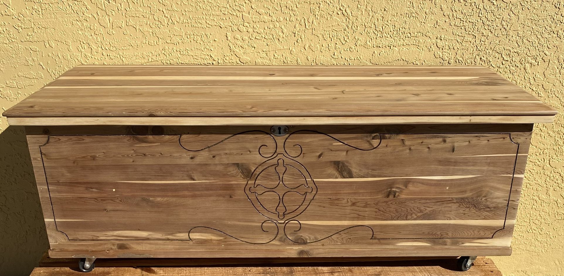 Chest was recently restored. The cedar was bleached with a 2 part bleach so the red colors in cedar would be minimized. Lock was disabled for child safety. Measurements in inches 44 long 18 1/2 deep 15 3/4 tall inc Wheels which are 2 inches
