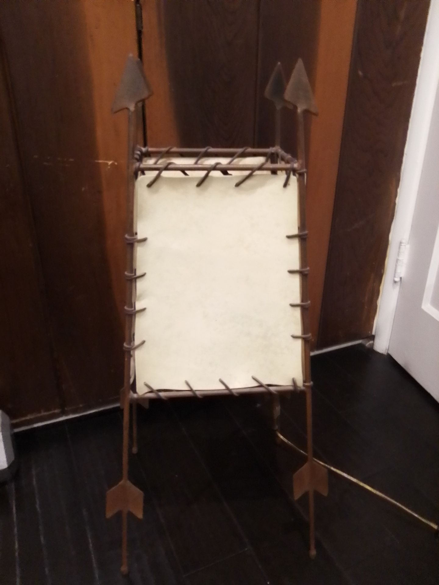 Beautiful one-of-a-kind handmade floor lamp with a rustic, Western-inspired design. Features a sturdy metal frame with arrow details and a warm, natural rawhide-style shade that gives off a cozy, ambient light. Perfect for adding character to your living room, bedroom, or studio. Great conversation piece and ideal for rustic, vintage, or Southwestern decor.