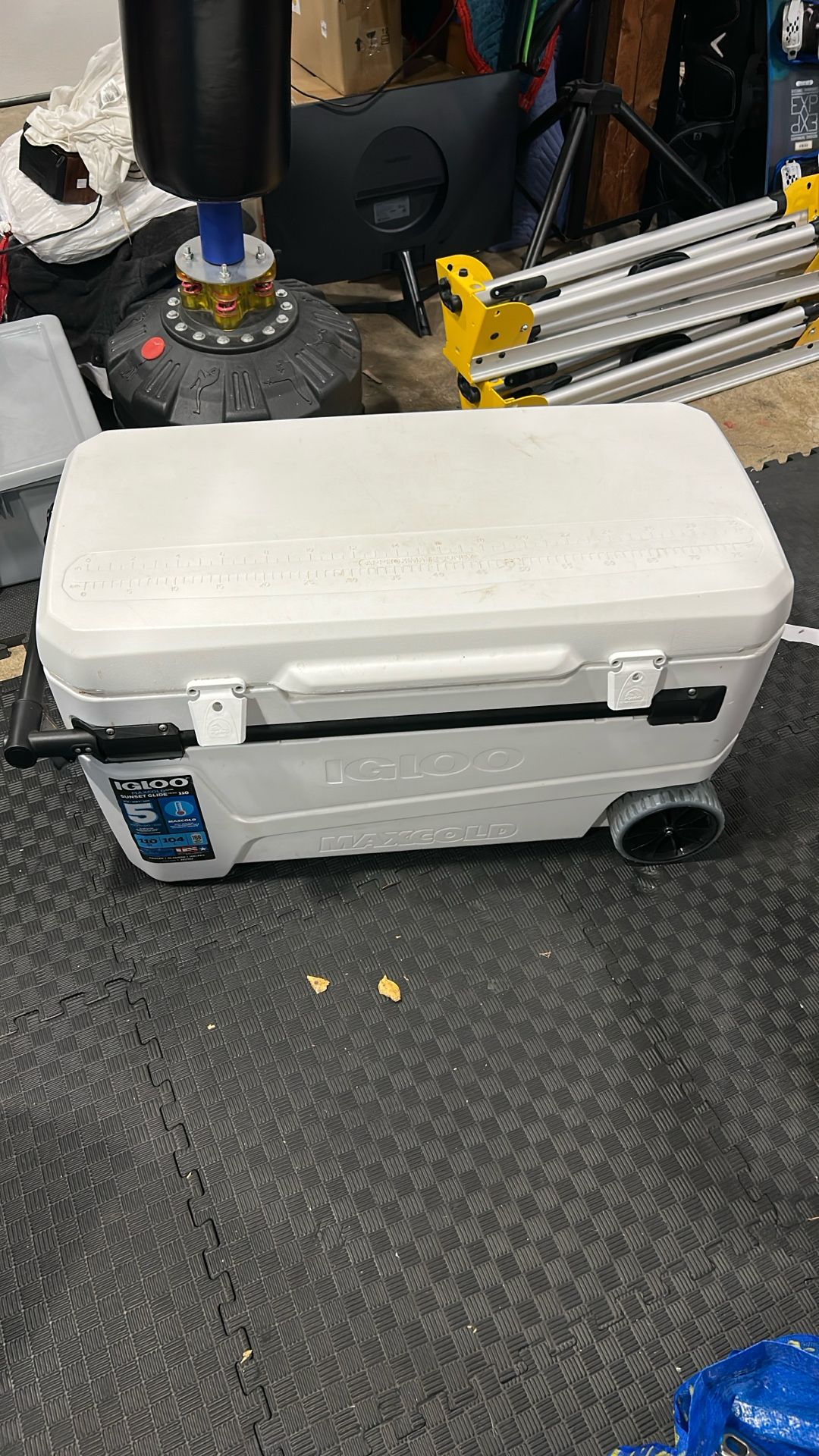 Igloo cooler with wheels and handle. Kept dry between uses- used 3 times. Pet/smoke-free home.