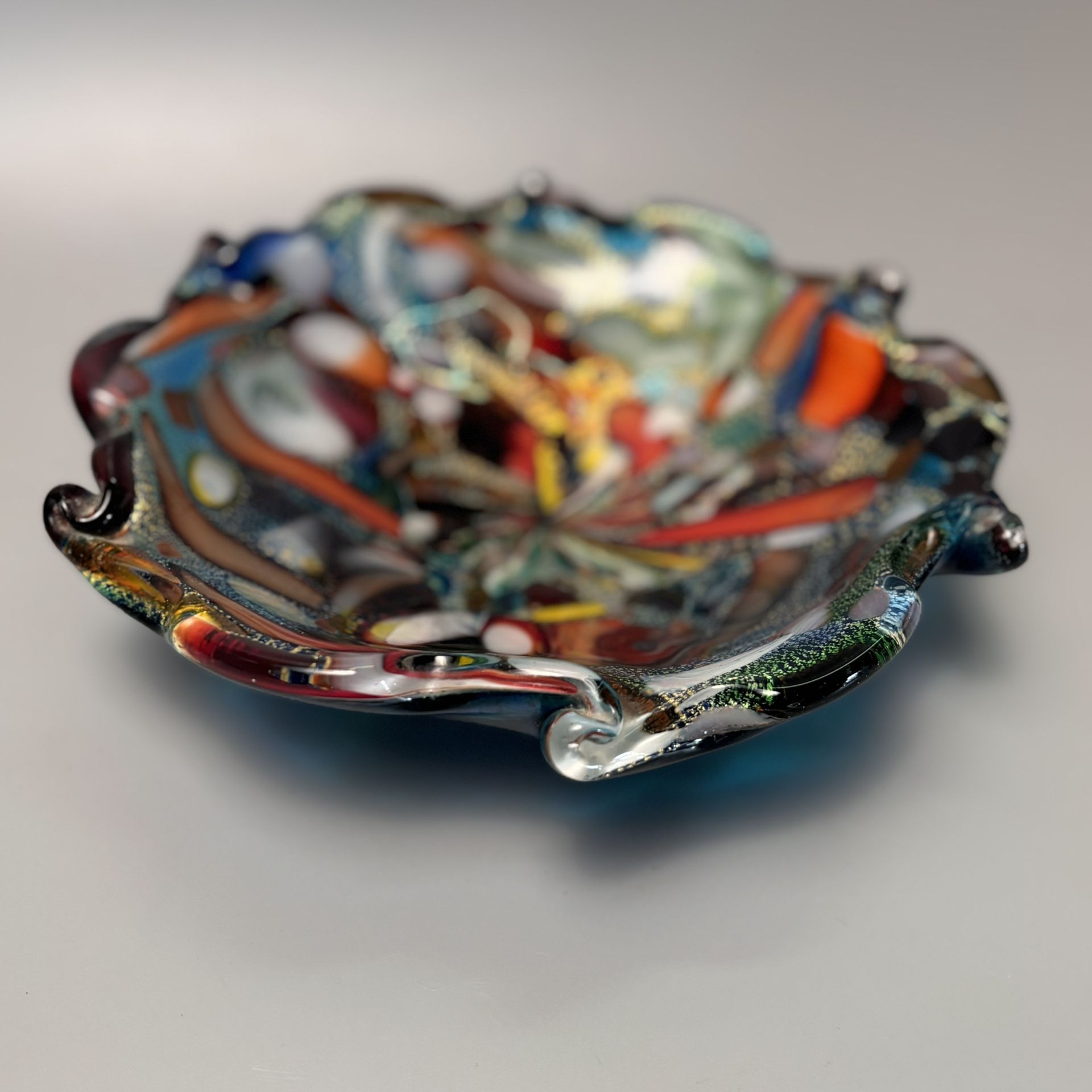 Absolutely, gorgeous, colorful glass dish with fluted edges. Built over a base of turquoise blue, which casts a beautiful shadow when lit from above