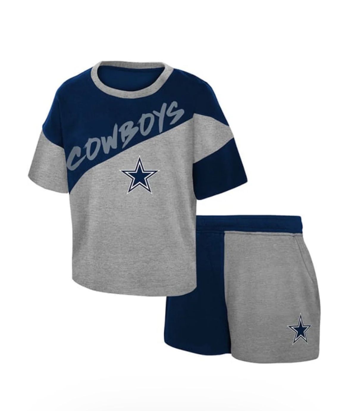 Your future Cowboys fan will look cute in this Dallas Cowboys Superstar Set! This Cowboys Set features a soft hand screen print team graphic. Soft hand screen print team graphic Short is a lightweight French Terry fabric. Top is a cotton jersey burnout fabric. Shorts have an elastic waistband. Asymmetrical design with color blocking Perfect for any young sports fan! Import, Domestic Officially Licensed