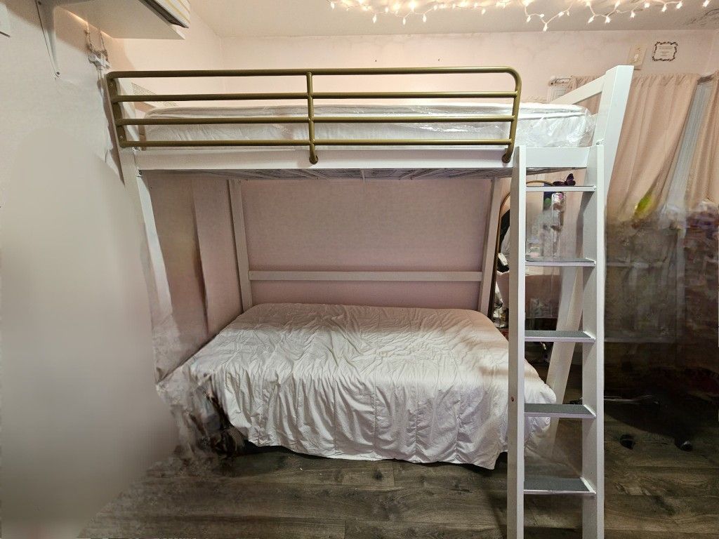 - White frame with gold railing Loft Bed fits a Standard Twin Mattress with a maximum height of 6 inches (included) -Weight Capacity: 200lb - Twin size: Overall width side to side: 60.5W Other Dimentions: - Overall: 72"H X 79.5"L - Headboard: 14"H X 39"W X 2"D - Footboard: 14"H X 39"W - Bottom of top bunk or loft to floor: 58" - Overall Product Weight: 123lb - 2 Person Assembly Required - Tools Not Included - Avoid Power Tools - Ladder Orientation: Right - Slat Kit Included - Side Rails Included - Frame Material: Metal - Bed Type: Loft Bed - Lightly Used - Great Condition - Bottom Mattress NOT Included - Plastic Wrapped Top Mattress Still Included - Instructions Included