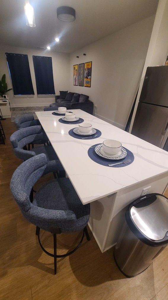 Like new counter height swivel bar stools. Blue with adjustable feet for balancing on uneven floors. Live alone, was basically for decor and if I had company. Barely used.