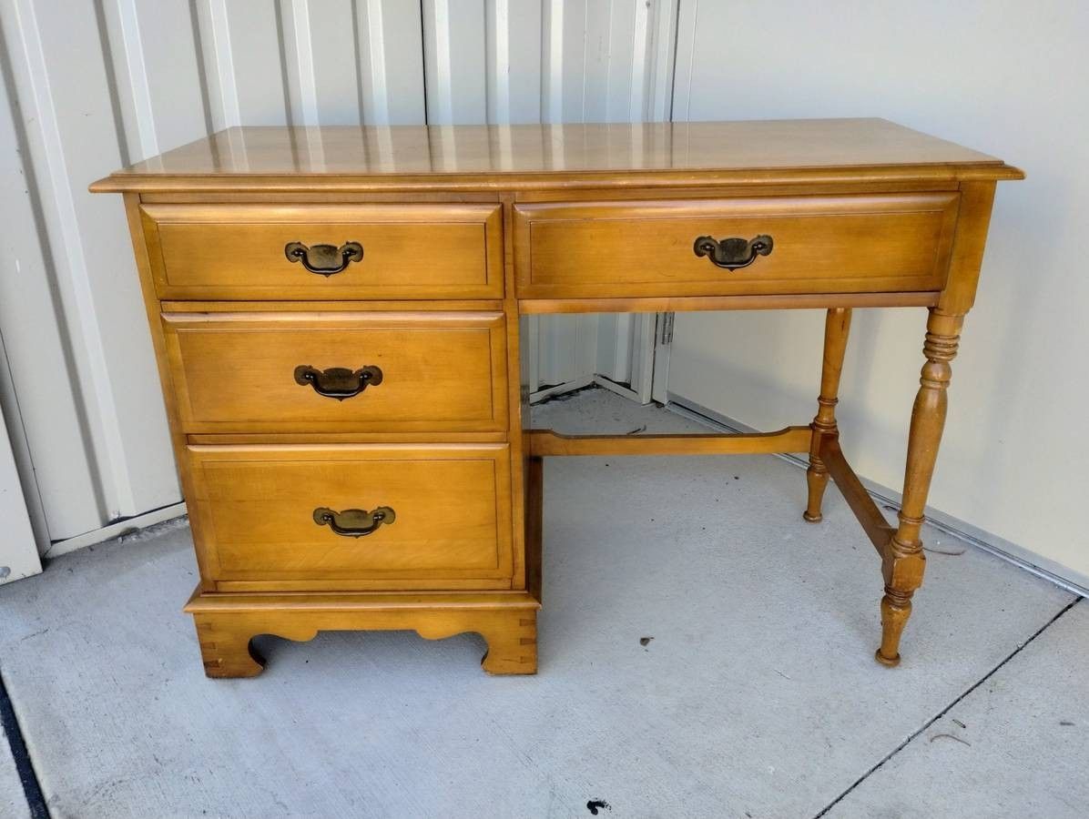 Vintage Kneehole/Student Desk. Originally Manufactured in the 1960's. Rock Maple Wood. 4 Smooth Sliding, Dovetail Jointed Drawers with Wood Glides and Runners. Cool Original Handles. Solid and Sturdy. Excellent Quality and Vintage Condition! Asking $225. Width - 44" Depth - 19" Height - 30.75" Kneehole - 21"(W) x 23" (H) I can deliver for a small fee (depends on the location) If interested, please call or text me. show contact info We specialize in Cool Vintage Furniture. To see the other items I have listed, please do a search on Craigslist or Facebook using my phone number... (contact info removed). Or, on Facebook, check out my Marketplace Profile. All of the items we have for sale are in our storage facility and here is the address... Cardinal Self Storage, 4200 Columbus Club Drive, Raleigh, 27610. Very Close to the Intersection of New Bern Ave and New Hope Road. Everything is shown by appointment. Cash, Venmo, Zelle, Cash App Accepted. No Personal Checks Please. Thanks for looking! Mike and Tanna Item #2113