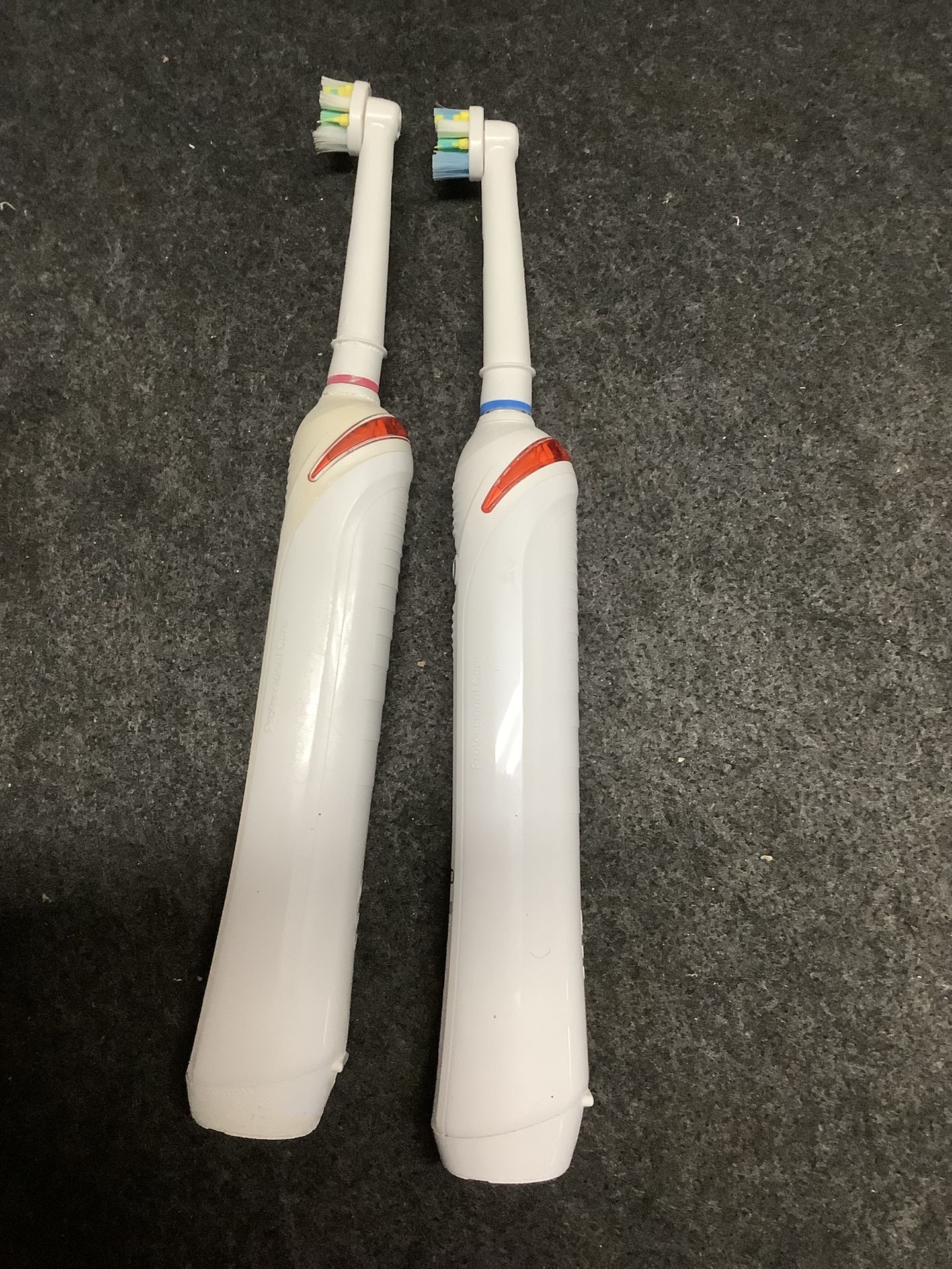 Braun Oral-B brand. Both power handles work fine and hold charge well. Extra included replacement brushes are unused. Includes charger.