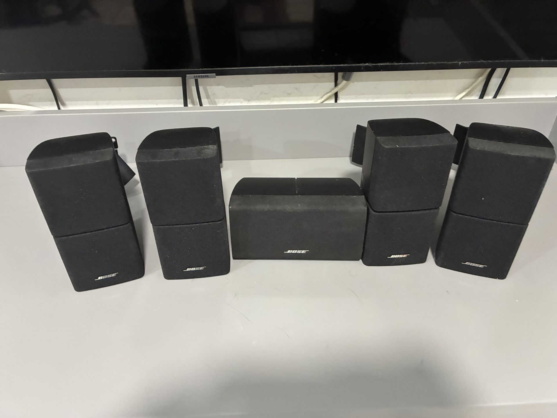 Bose home theater speaker set with 5 speakers total. All speakers work great and are in good condition with light cosmetic wear. Wall-mount brackets included. Includes: • 5 Bose speakers • Mounting brackets Does NOT include: subwoofer, receiver, or wires. Great for surround sound or home theater setup.