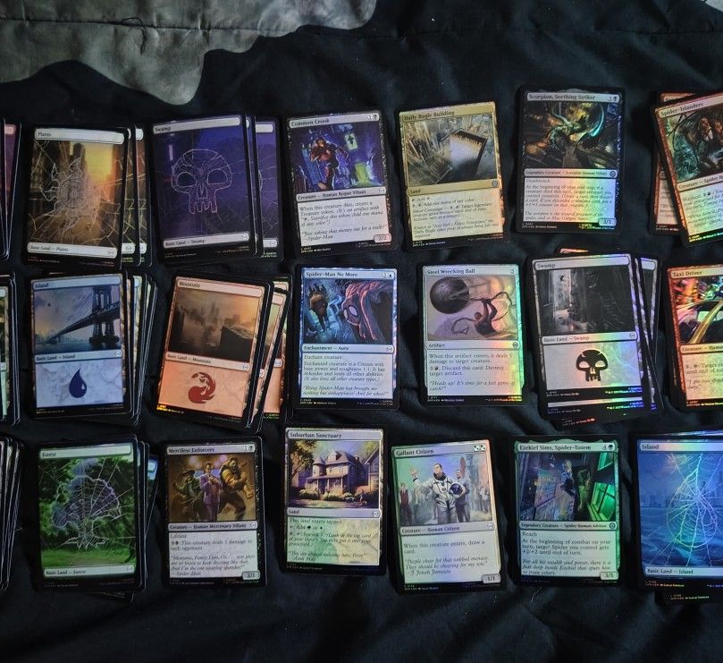 Magic The Gathering Spider-Man Foil Cards Cards Total: 70 Foils Scorpion seething striker U 0064 legendary creatures scorpion human villain Suburban sanctuary L 0185 land Gallant citizen C 0129 creature human citizen Steel wrecking Ball C 0177 artifact Spider-Man no more C 0045 enchantment aura Ezekiel Sims spider totem U 0100 legendary creature spider human advisor Daily bugle building U 0179 land Common crook c0053 creature human road villain Merciless enforcers c0058 creature human mercenary villain 3 Mountain L 0192 basic land 8 Plains L 0194 basic land 7 Mountain L 0197 basic land 3 Plains O 0189 basic land 7 Forest L 0198 basic land 2 Spider Islanders C 0091 creature spider horror citizen 2 taxi driver C 0097 creature human pilot 8 Island L 0195 basic land 4 Swamp L 0191 basic land 5 Forest L 0193 basic land 7 Swamp L 0196 basic land 4 Island L 0190 basic land